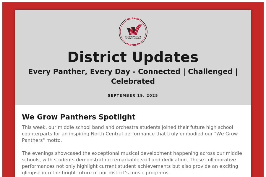 District Updates Every Panther, Every Day - Connected | Challenged | Celebrated September 19, 2025 We Grow Panthers Spotlight This week, our middle school band and. . .